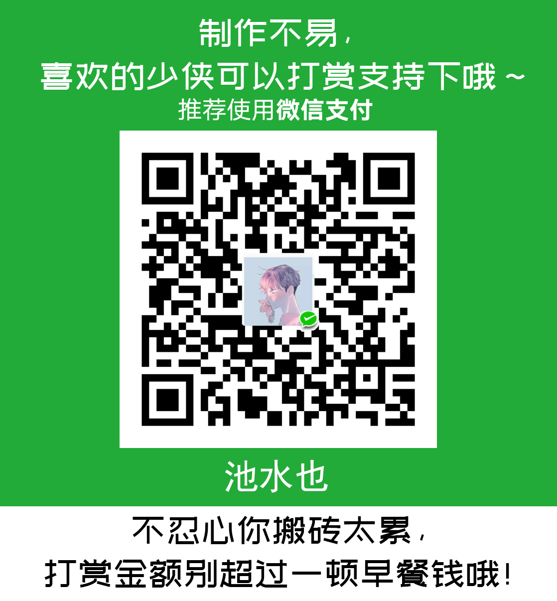 | 爱发电 => 打赏 | 点我前往打赏 或 扫右侧二维码打赏噢 Ps:喜欢的少侠可以打赏支持下哦~ 不忍心你搬砖太累,打赏金额别超过一顿早餐钱哦! |